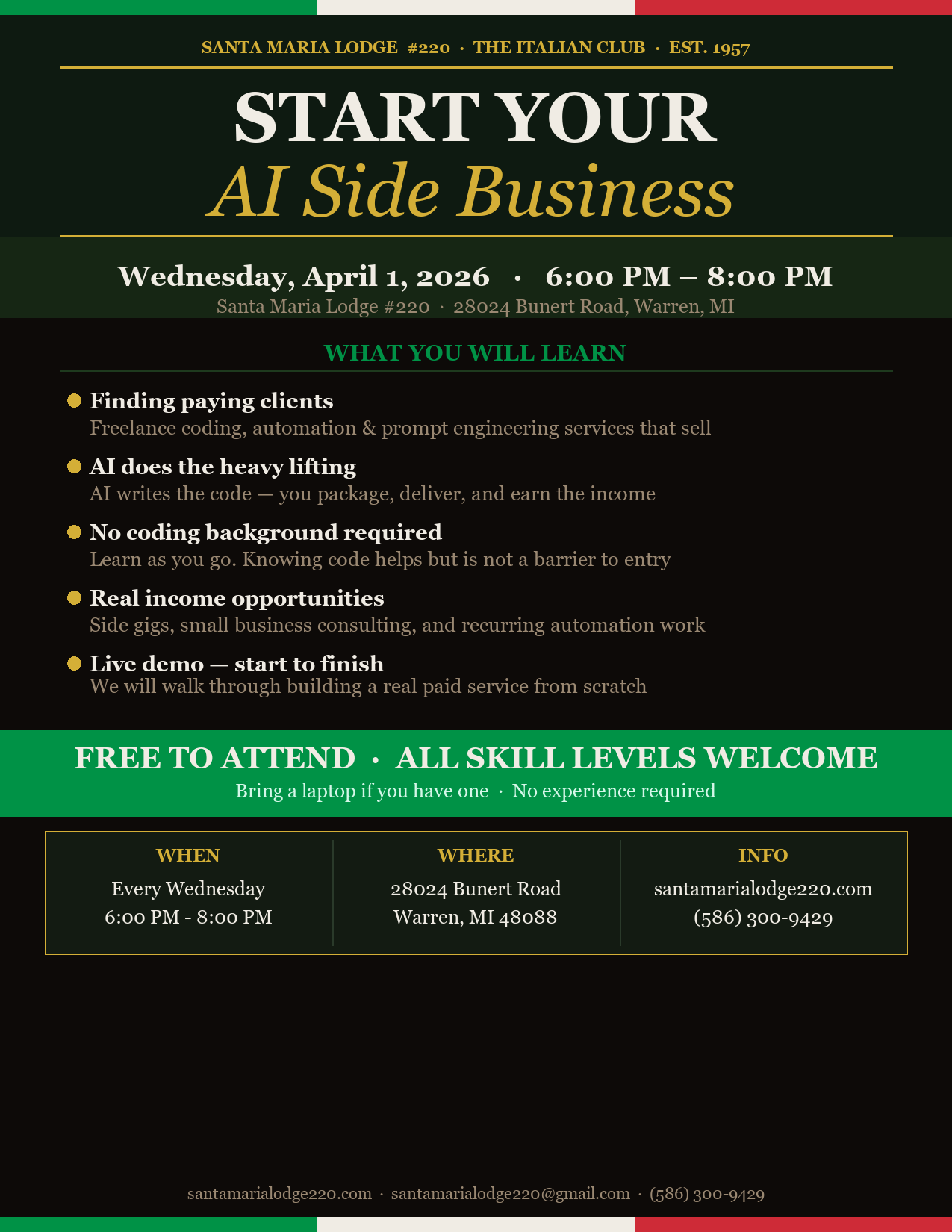This Wednesday, April 1 at 6:00 PM at the lodge. We'll cover how to turn your AI skills into real income — freelance coding, prompt engineering, and automation services. Every Wednesday at 6 PM. Free to attend. Bring a laptop if you have one.